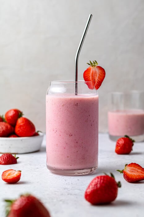 Ingredients With only a few ingredients, this nutritious Strawberry smoothie is fast and easy to make. It is loaded with vitamin C from the strawberries and calcium from the yogurt, and is bursting with flavor. Whip one up for a quick breakfast, or serve as a refreshing compliment to a summertime meal.- ​2 cups frozen townsend farms whole strawberries- 1 banana- 8-oz. container mixed berry yogurt- 1 cup milk- 2 tbs. sugar- ice cubesInstructions - ​combine ingredients in a blender- fill to the top with ice cubes- blend until smoothServing Suggestions - Serves : 4